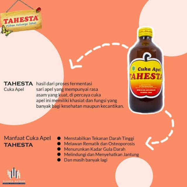 Cuka apel didapatkan dari hasil fermentasi jus apel. Manfaat cuka apel yang beragam, baik itu bagi kesehatan maupun kecantikan, membuat banyak orang mengincarnya untuk bisa mendapatkan khasiatnya. Cuka apel merupakan salah satu jenis cuka yang paling populer dalam hal kesehatan. Inilah 73 manfaat dan khasiat cuka apel tahesta untuk kesehatan kecantikan. Cuka apel atau apple cider vinegar dibuat dari sari buah apel yang telah mengalami fermentasi untuk membentuk probiotik dan enzim yang mempromosikan kesehatan tubuh, sehingga kandungannya hanya ada sedikit gula.